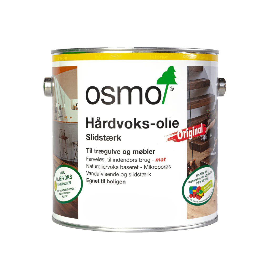 Osmo Hårdvoks-olie Original er perfekt til trægulve og møbler, Den er baseret på naturlige olier og voks, som giver en holdbar og flot overflade, hvor træets naturlige struktur bevares. Overfladen bliver vand og smudsafvisende, slidstærk og naturtro. Sammenlignet med traditionelle produkter, giver de naturlige planteolier en jævn farve og et harmonisk udseende. Nem at anvende, kræver ingen grunding og mellemslibning. Brug enten Hårdvoks-olie Original til grundbehandling og slutbehandling, eller anvend den som slutbehandling efter fx. en farvning med andre Osmo produkter.