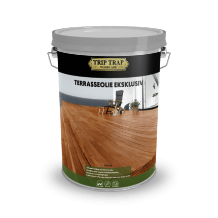 - Både nye og tidligere oliebehandlede træterrasser skal rengøres med Trip Trap Møbel- og Terrasserens eller Intensiv Udendørs Trærens, inden oliering.